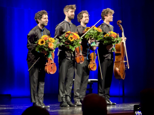 Zunächst waren es die großen Streichquartette von Grieg und Dvorak, die auf dem Programm standen. Man erlebte einen intensiven Klang von den vier Musikern – und zwar intensiv in piano und forte. War das nicht vielleicht auch ein Erlebnis des Spiels im Stehen? Jeder Chorsänger weiß, dass da was im Körper passiert, dass man auf einem Stuhl nicht aus sich herausholen kann. Das wird jeder Bläser bestätigen.