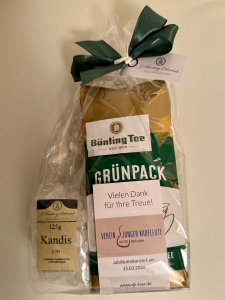 Die Besucher wurden noch zu einem Glas Sekt eingeladen und jeder bekam ein kleines Tee-Präsent, damit die Erinnerung an diesen besonderen Abend möglichst lange erhalten bleibt.